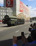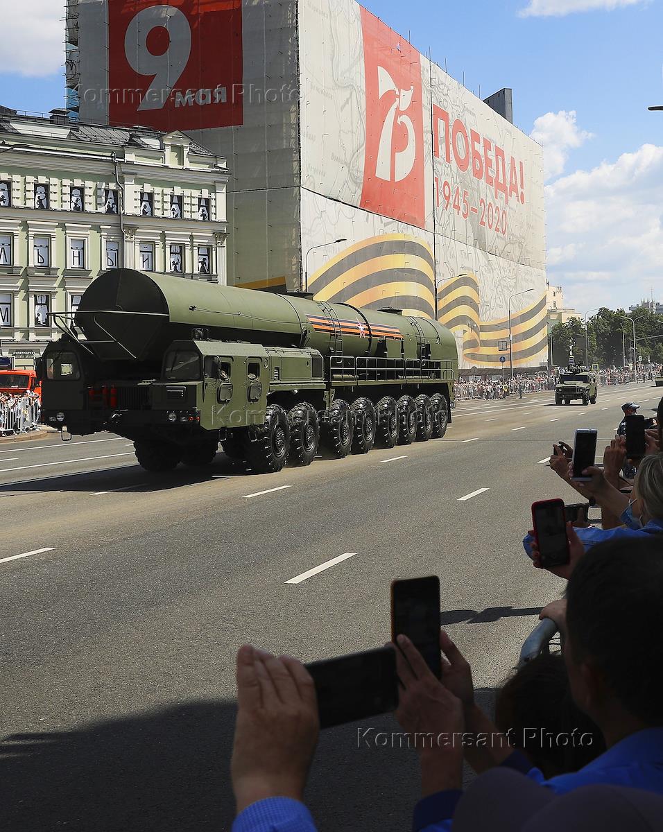Военный парад, посвященный 75-й годовщине Победы в Великой Отечественной войне на Красной площади. Проход военной техники по Арбатской площади. Пусковая установка подвижного грунтового ракетного комплекса "Ярс".