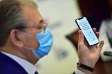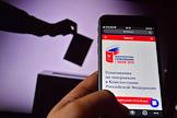 Онлайн голосование по поправкам в Конститиуцию России. Жанровая фотография. Регистрация для голосования на портале mos.ru на экране мобильного телефона заместителя председателя ЦИК России Николая Булаева.