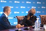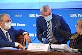 Общероссийское голосование по поправкам к Конституции России. День первый. Председатель Центральной избирательной комиссии (ЦИК) России Элла Памфилова (справа) и заместитель председателя ЦИК России Николай Булаев (слева) во время прессконференции в Информационном центре ЦИК России.