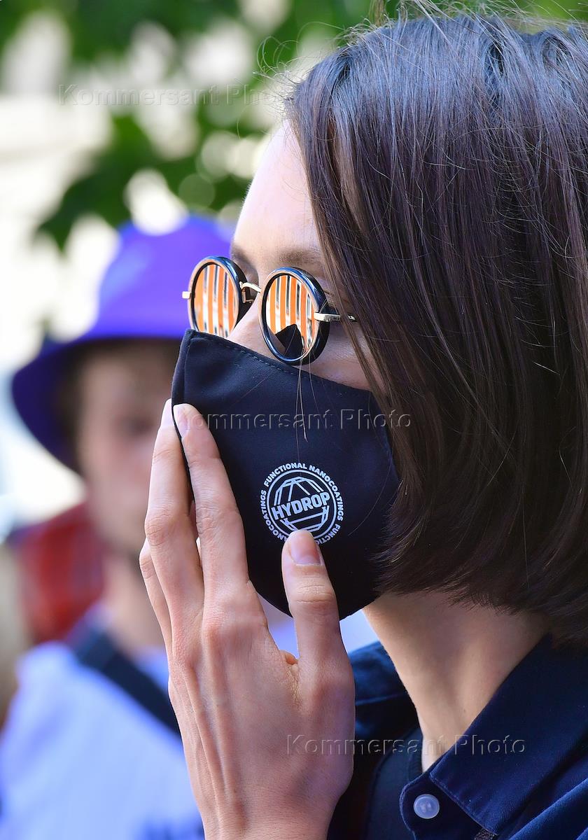 Вынесение приговора по уголовному делу о хищении бюджетных средств, выделенных автономной некоммерческой организации "Седьмая студия" в Мещанском районном суде. Участники митинга протеста против решения по делу "Седьмой студии" на площади у здания суда. Жанровая фотография. Девушка в защитном респираторе.