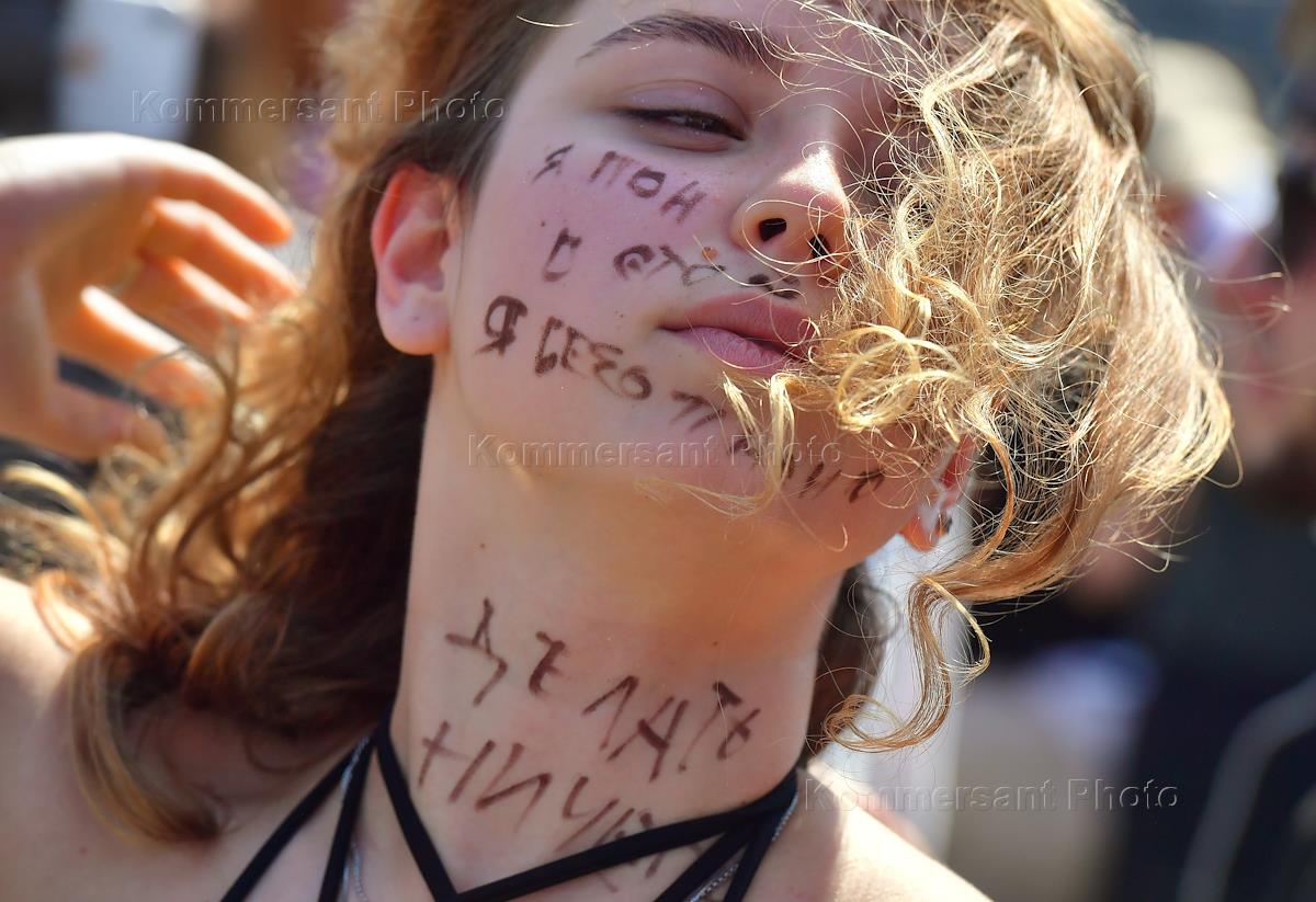 Sentencing in the case of embezzlement of public funds allocated to autonomous noncommercial organization "Seventh Studio" in the Meshansky District Court. Participants of a protest rally against court's decision in the Seventh Studio case protest on the square in front of the courthouse. Genre photo. Young woman wearing respirator mask.