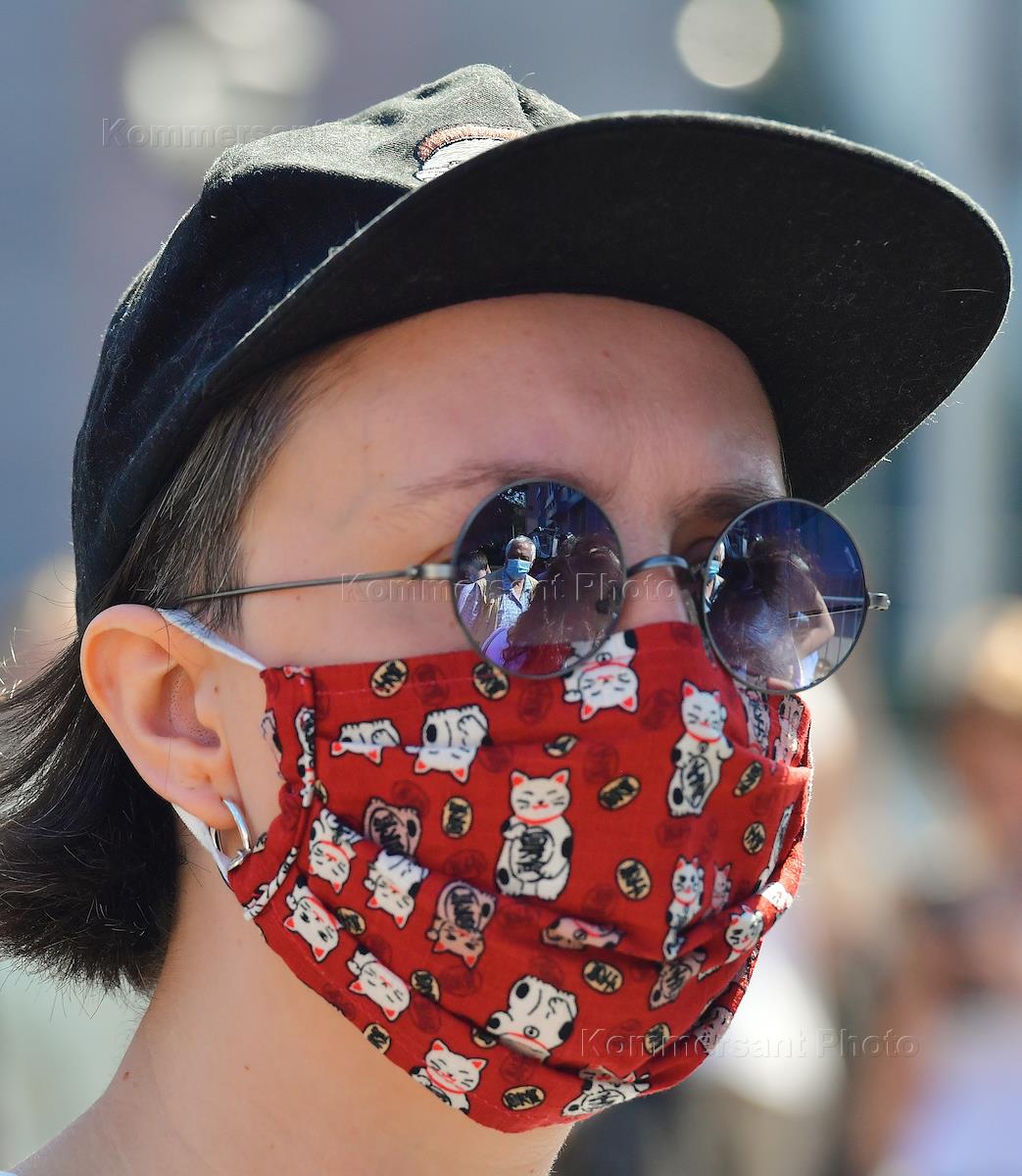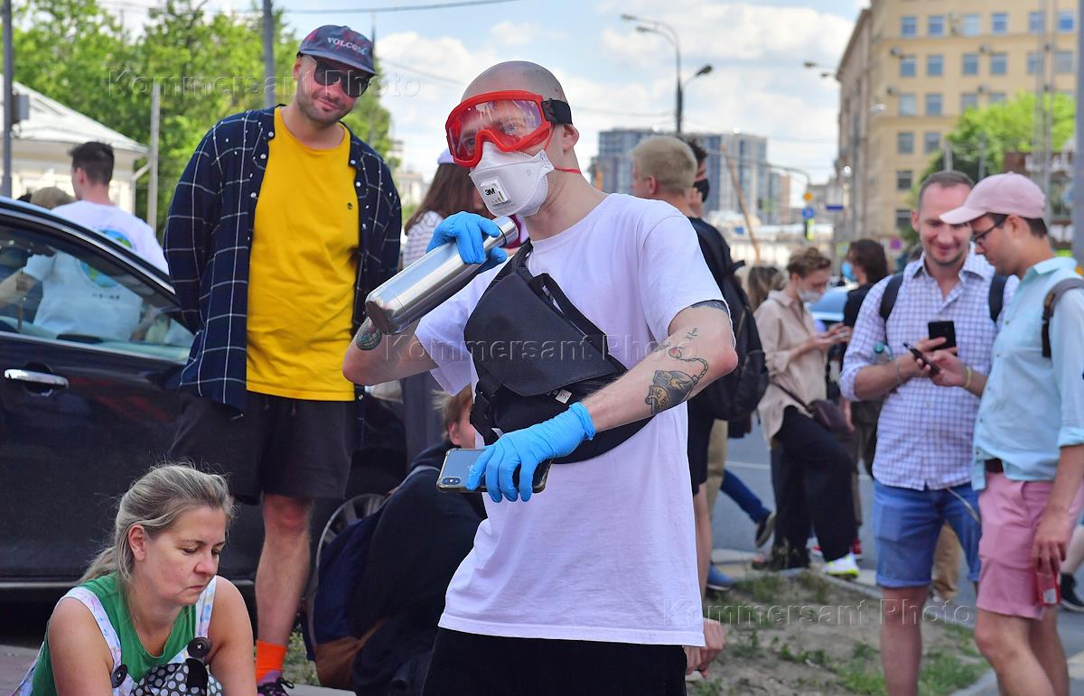Вынесение приговора по уголовному делу о хищении бюджетных средств, выделенных автономной некоммерческой организации "Седьмая студия" в Мещанском районном суде. Участники митинга протеста против решения по делу "Седьмой студии" на площади у здания суда. Жанровая фотография. Девушка в защитном респираторе.