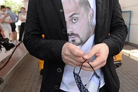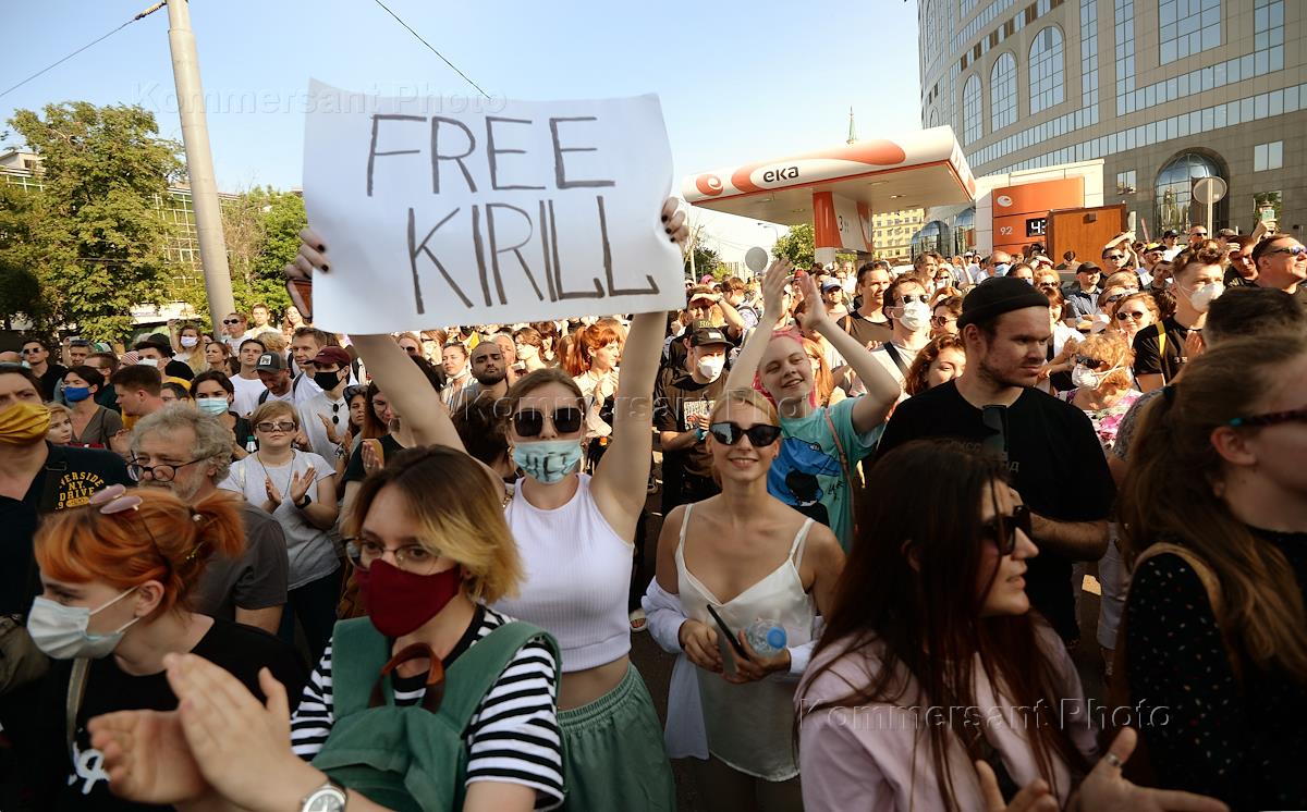 Вынесение приговора по уголовному делу о хищении бюджетных средств, выделенных автономной некоммерческой организации "Седьмая студия" в Мещанском районном суде. Участники митинга протеста против решения по делу "Седьмой студии" на площади у здания суда. Жанровая фотография. Футболка с потретом фигуранта дела, художественного руководителя "Гоголь-центра", режиссера Кириллом Серебренниковым у участника митинга.