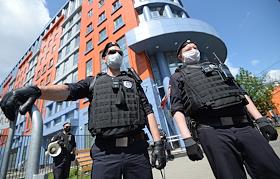 Вынесение приговора по уголовному делу о хищении бюджетных средств, выделенных автономной некоммерческой организации "Седьмая студия" в Мещанском районном суде. Сотрудники полиции на площади у здания суда.