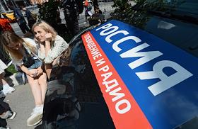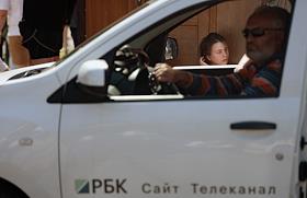 Вынесение приговора по уголовному делу о хищении бюджетных средств, выделенных автономной некоммерческой организации "Седьмая студия" в Мещанском районном суде. Жанровая фотография. Водитель за рулем автомобиля телеканала "РБК" возле здания Мещанского суда.
