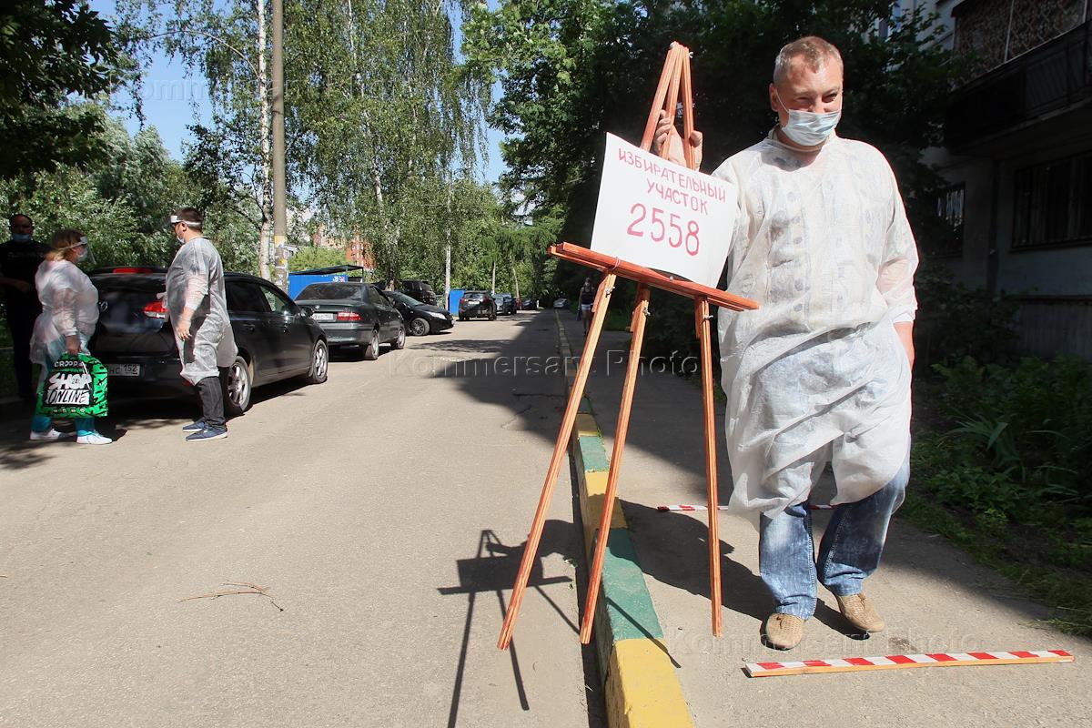 Общероссийское голосование по поправкам к Конституции России. Работа выездной избирательной комиссии у подъезда жилого дома.