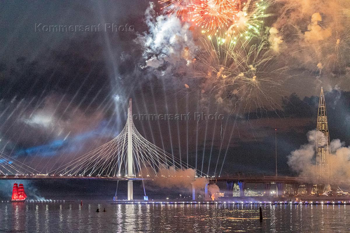 Праздник выпускников "Алые Паруса". Проход брига "Россия" по Финскому заливу. Салют во время праздника.