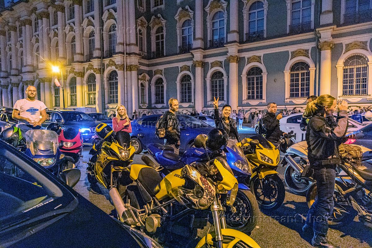 Праздник выпускников "Алые Паруса". Зрители на мотоциклах во время праздника.