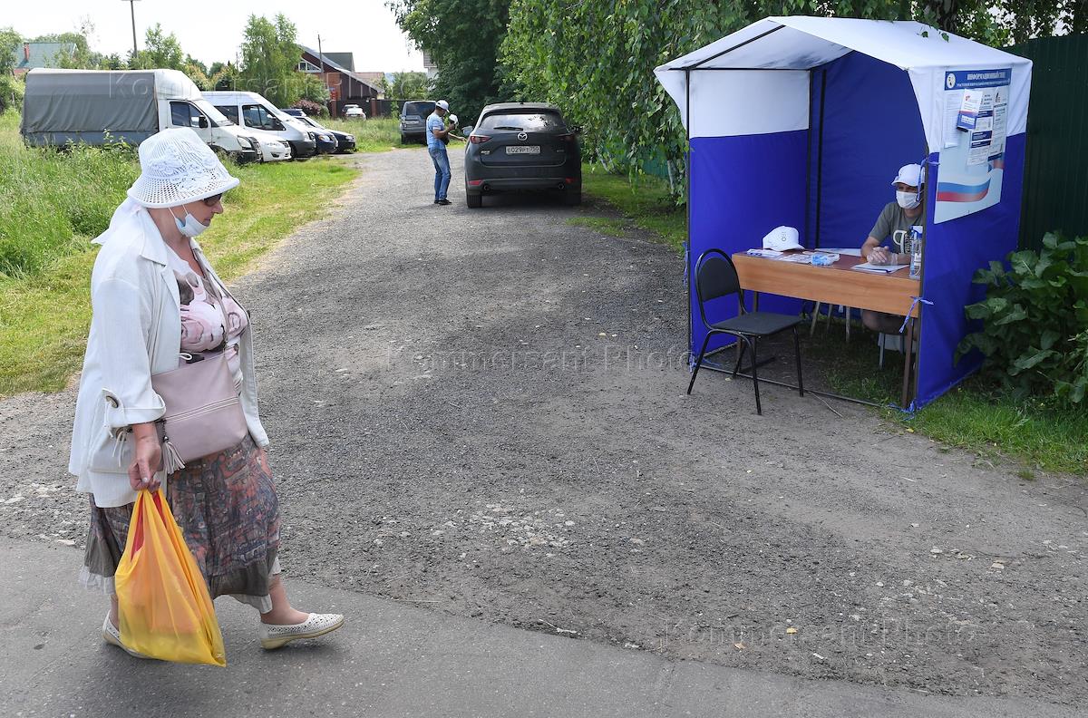 All-Russian vote on the constitutional amendments. Work of the Polling Station Commission No. 428 in the Vostryakovo microdistrict. Genre photo. Field path in the microdistrict.