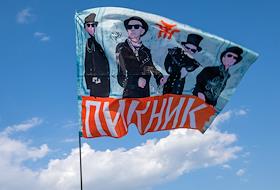 Автоконцерт "Белая полоса возвращения" в поддержку врачей в логопарке "Осиновая роща". Флаг с участниками группы "Пикник" в небе перед концертом.