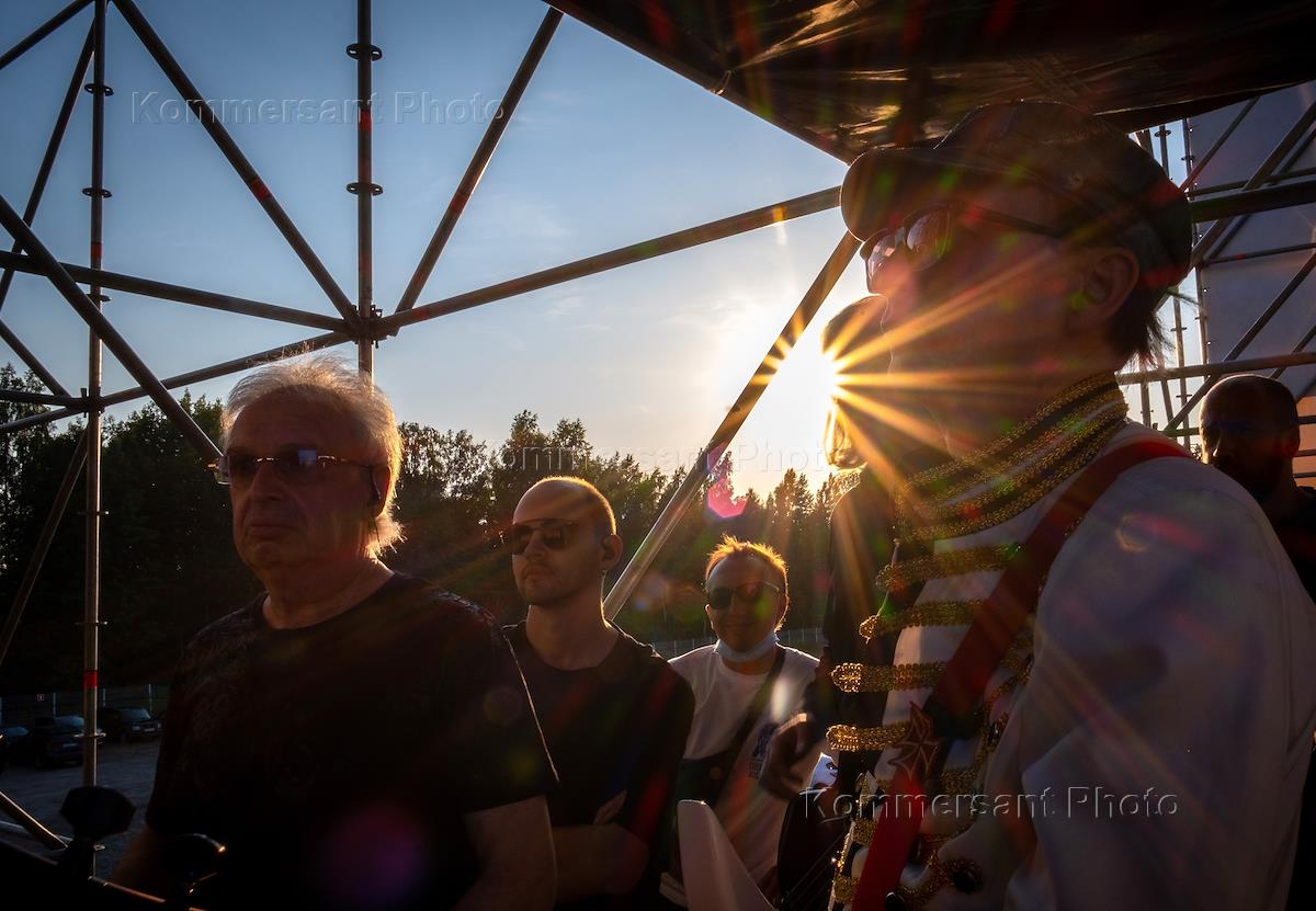 Автоконцерт "Белая полоса возвращения" в поддержку врачей в логопарке "Осиновая роща". Участники группы "Пикник" перед началом выступления.