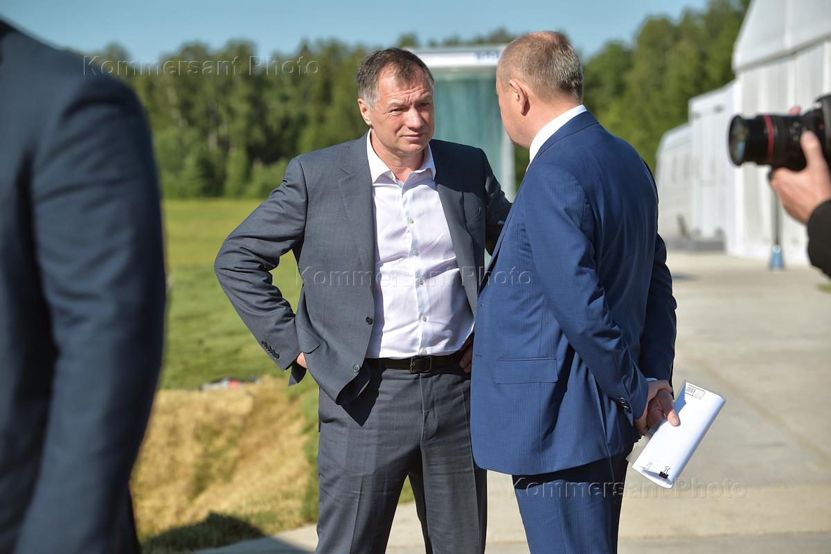 Церемония открытия участка протяженностью 23 км от Можайского до Новорижского шоссе на Центральной кольцевой автомобильной дороге (ЦКАД). Министр транспорта России Евгений Дитрих (слева) и заместитель председателя правительства России Марат Хуснуллин (справа) во время церемонии.