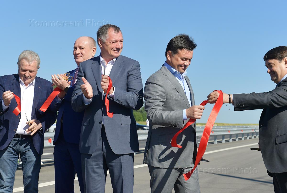 Церемония открытия участка протяженностью 23 км от Можайского до Новорижского шоссе на Центральной кольцевой автомобильной дороге (ЦКАД). Председатель комитета ГД по транспорту и строительству Евгений Москвичев (слева), заместитель председателя правительства России Марат Хуснуллин (в центре), губернатор Московской области Андрей Воробьев (второй справа) и помощник президента России Игорь Левитин (справа) во время церемонии.