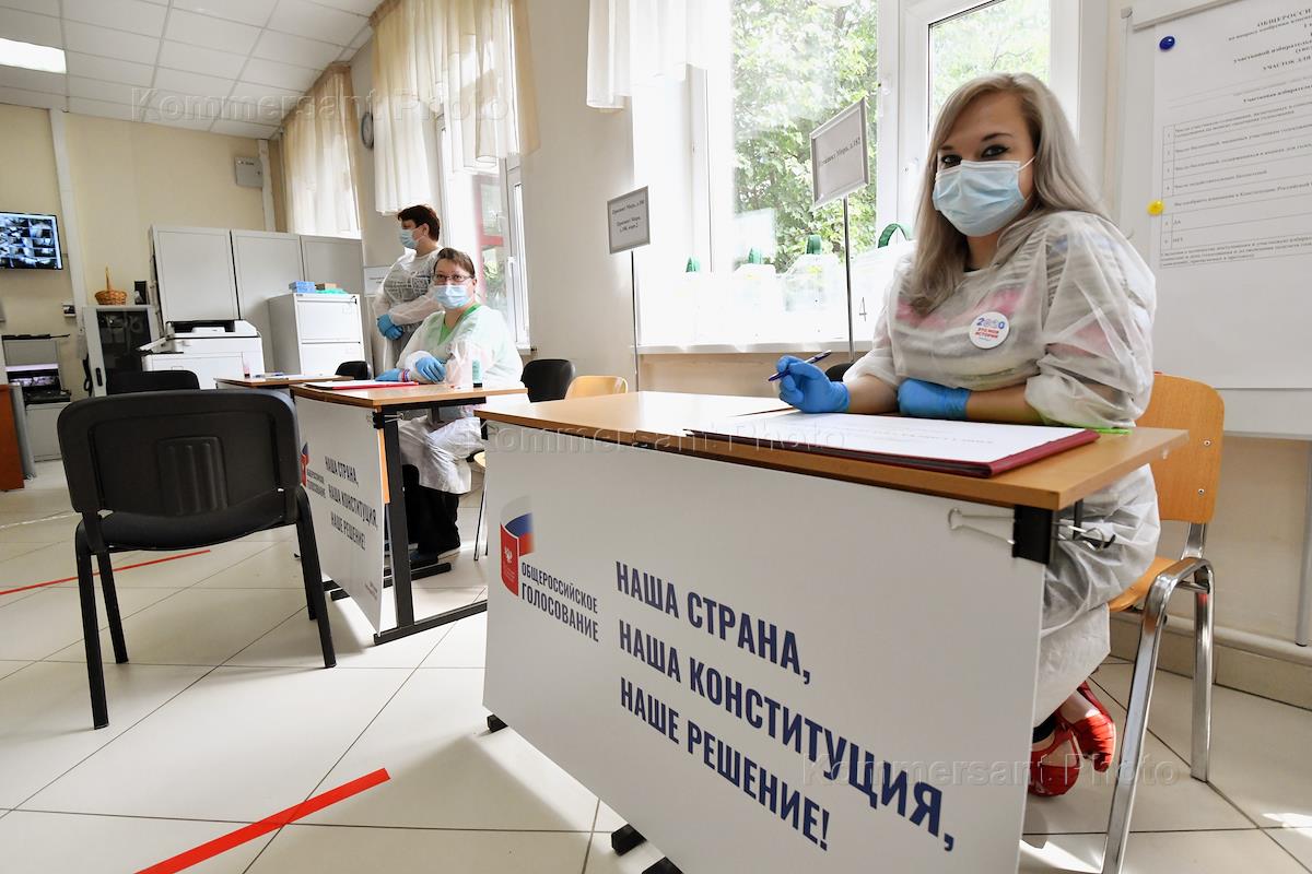 Общероссийское голосование по внесению поправкок в Конституции России. Работа участков. Сотрудники участковой избирательной комиссии в защитных халатах и медицинских масках на избирательном участке 945 в помещении Медицинского колледжа № 2.