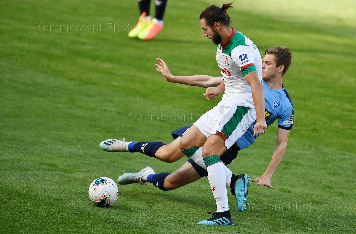 Российская Премьер-Лига (РПЛ). Чемпионат России по футболу 2019/2020. 24-й тур. Матч между командами "Локомотив" (Москва) и "Крылья Советов" (Самара) на стадионе "РЖД Арена". Игрок команды "Локомотива" Гжегож Крыховяк (слева) и игрок команды "Крылья Советов" Виталий Лысцов (справа) во время матча.