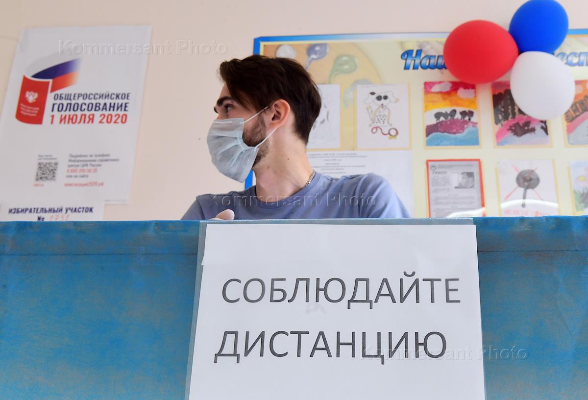 Общероссийское голосование по поправке к Конституции России. Избиратель в медицинской маске перед входом на избирательный участок.