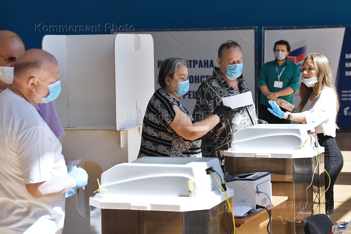 Общероссийское голосование по поправкам к Конституции России. Избиратели на избирательном участке в Доме творчества на Миуссах во время голосования.