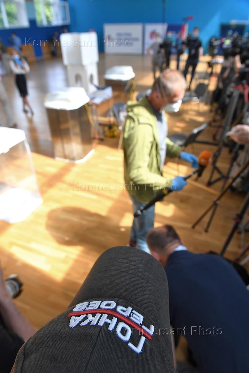 Общероссийское голосование по поправкам к Конституции России. Фотокорреспонденты и сотрудник коммунальных служб на избирательном участке в Доме творчества на Миуссах перед началом голосования лидера КПРФ, члена комитета Государственной думы России по делам Содружества Независимых Государств, евразийской интеграции и связям с соотечественниками Геннадия Зюганова.