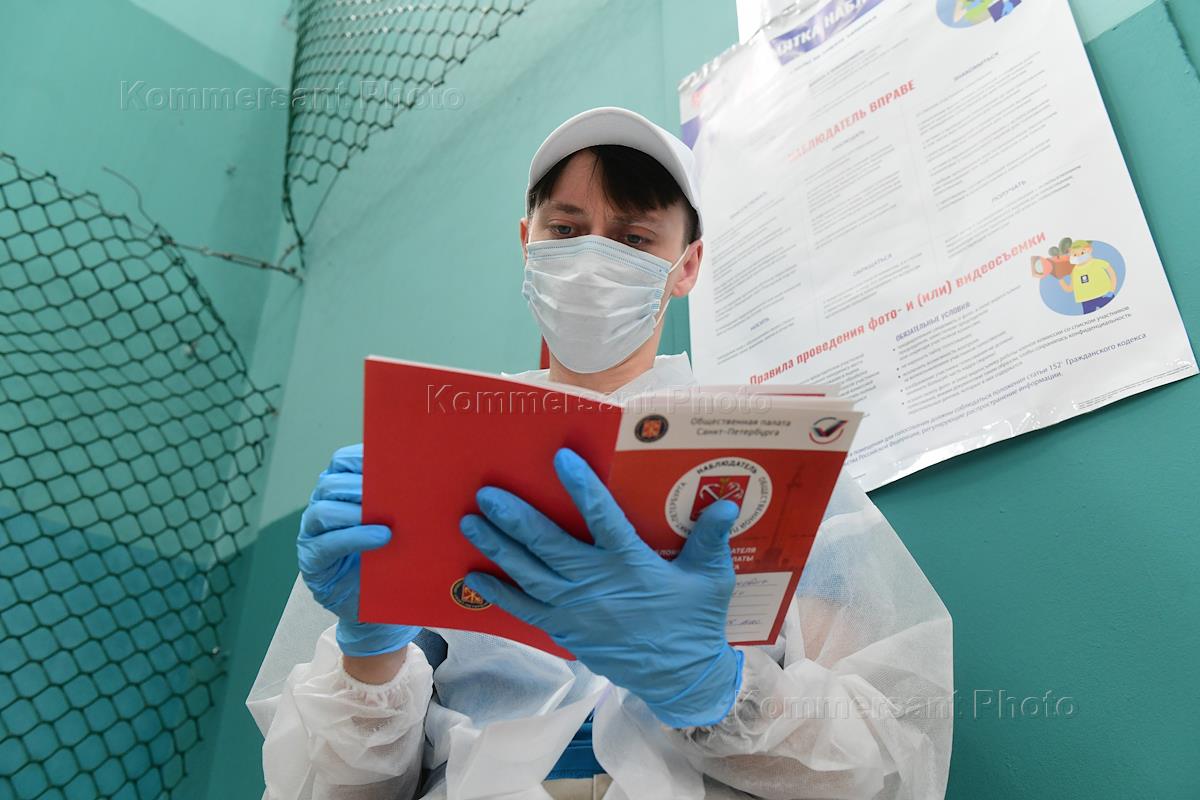 Общероссийское голосование по поправкам к Конституции России. Сотрудник участковой избирательной комиссии в защитной одежде на избирательном участке.