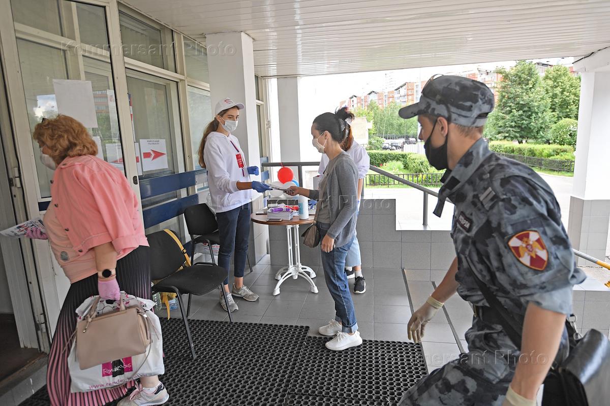 Общероссийское голосование по поправкам к Конституции России. Работа избирательного участка. Люди во время голосования.