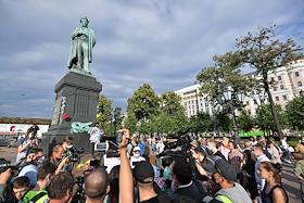 Участники несанкционированного митинга против изменения в Конституцию России на Пушкинской площади.