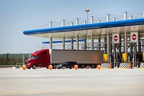 Церемония открытия платного участка федеральной трассы М-4 "Дон" протяженностью 85 км в обход города Павловска и села Лосево. Стенд со стоимостью проезда по участку.