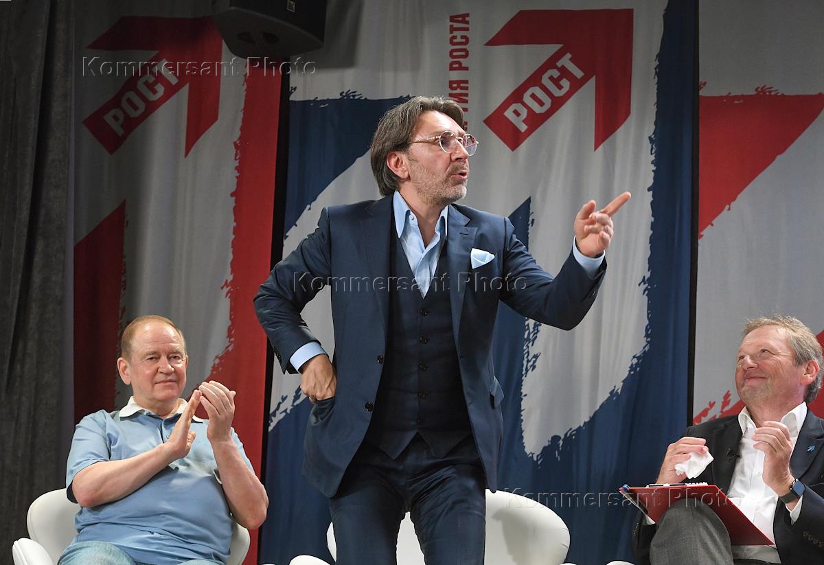 Съезд Всероссийской политической "Партии Роста" в башне Mercury Московского Международного делового центра (ММДЦ) "Москва-сити" на event-площадке Mercury Space. Член "Партии Роста", музыкант Николай Фоменко (слева) и председатель "Партии Роста", уполномоченный при президенте России по защите прав предпринимателей Борис Титов (в центре) на съезде.