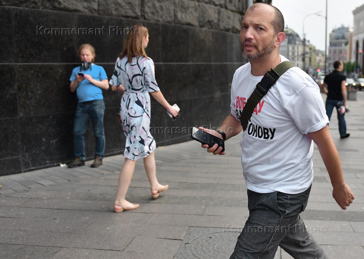 Пикеты у здания ФСБ России в поддержку советника гендиректора "Роскосмоса", бывшего журналиста Издательского дома "Коммерсантъ" Ивана Сафронова, задержанного по подозрению в госизмене. Бывший издатель газеты "Ведомости" Демьян Кудрявцев во время пикетов.