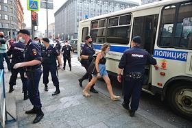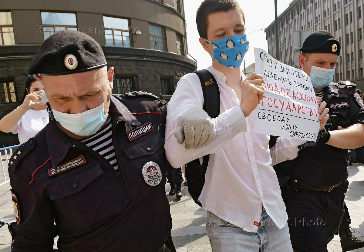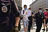 Пикеты у здания ФСБ России в поддержку советника гендиректора "Роскосмоса", бывшего журналиста Издательского дома "Коммерсантъ" Ивана Сафронова, задержанного по подозрению в госизмене. Сотрудники полиции во время задержания участников пикетов.