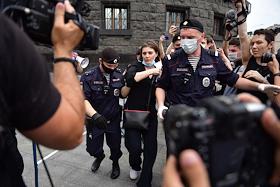 Пикеты у здания ФСБ России в поддержку советника гендиректора "Роскосмоса", бывшего журналиста Издательского дома "Коммерсантъ" Ивана Сафронова, задержанного по подозрению в госизмене. Сотрудники полиции во время задержания корреспондента агентства Reuters Полины Никольской (в центре).
