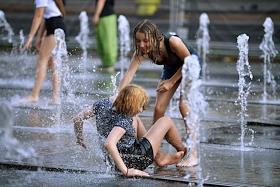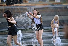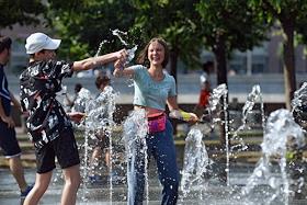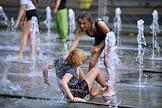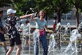Жанровая фотография. Жара в Москве. Молодые люди купаются в фонтане парка "Музеон".