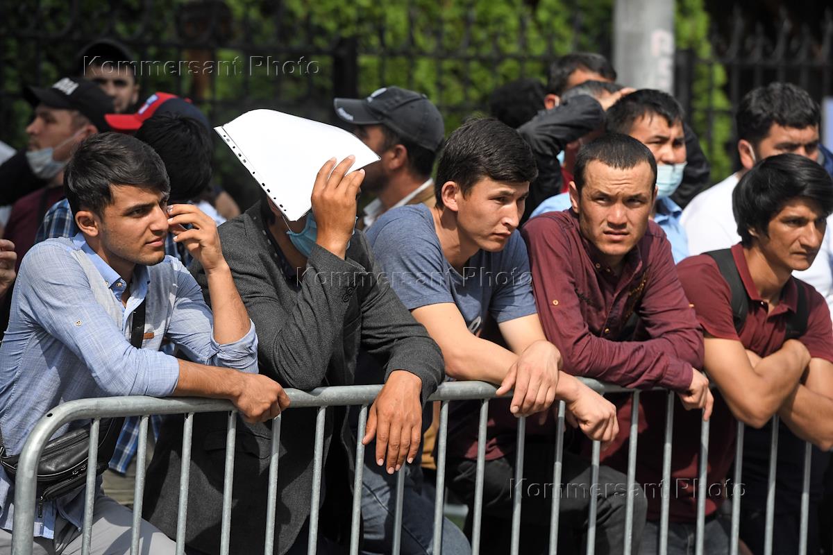 Ситуация у посольства Таджикистана в Москве. Граждане Таджикистана, которые не могут покинуть Россию, пришли к посольству Республики Таджикистан в Гранатном переулке. После снятия ограничительных мер они пытались вернуться на родину, но не смогли попасть на чартерные рейсы. Чрезвычайный и Полномочный Посол Таджикистана в России Имомуддин Сатторов (второй справа) во время общения с гражданами.