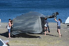 "Дикий отдых" в Крыму. Отдыхающие устанавливают палатку на берегу моря.