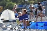 "Дикий отдых" в Крыму. Отдыхающие на пляже. Девочка с младшим братом на берегу моря.