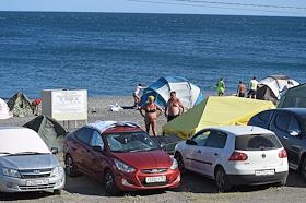 "Дикий отдых" в Крыму. Автомобили и палатки отдыхающих на берегу моря.
