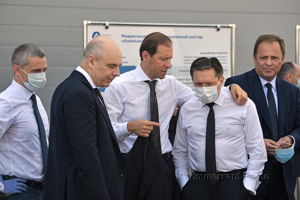 Рабочая поездка председателя правительства России Михаила Мишустина в Елабугу. Слева направо: генеральный директор компании Umatex Александр Тюнин, министр финансов России Антон Силуанов, министр промышленности и торговли России Денис Мантуров, генеральный директор госкорпорации "Росатом" Алексей Лихачев и полномочный представитель президента в Приволжском федеральном округе Игорь Комаров во время посещения предприятия "Алабуга-Волокно" на территории особой экономической зоны (ОЭЗ) "Алабуга".