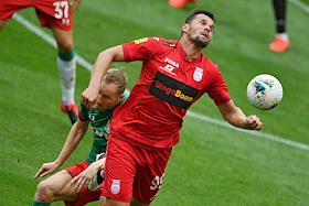 Тинькофф Российская Премьер-Лига (РПЛ). Чемпионат России по футболу 2019/2020. 28-й тур. Матч между командами "Локомотив" (Москва) и "Уфа" (Уфа) на стадионе "РЖД Арена". Игрок команды "Локомотив" Гжегож Крыховяк (справа) и игрок команды "Уфа" Ловро Бизяк (слева) во время матча.