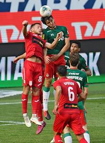 Тинькофф Российская Премьер-Лига (РПЛ). Чемпионат России по футболу 2019/2020. 28-й тур. Матч между командами "Локомотив" (Москва) и "Уфа" (Уфа) на стадионе "РЖД Арена". Игрок команды "Локомотив" Гжегож Крыховяк (слева) и игрок команды "Уфа" Остон Урунов (справа) во время матча.