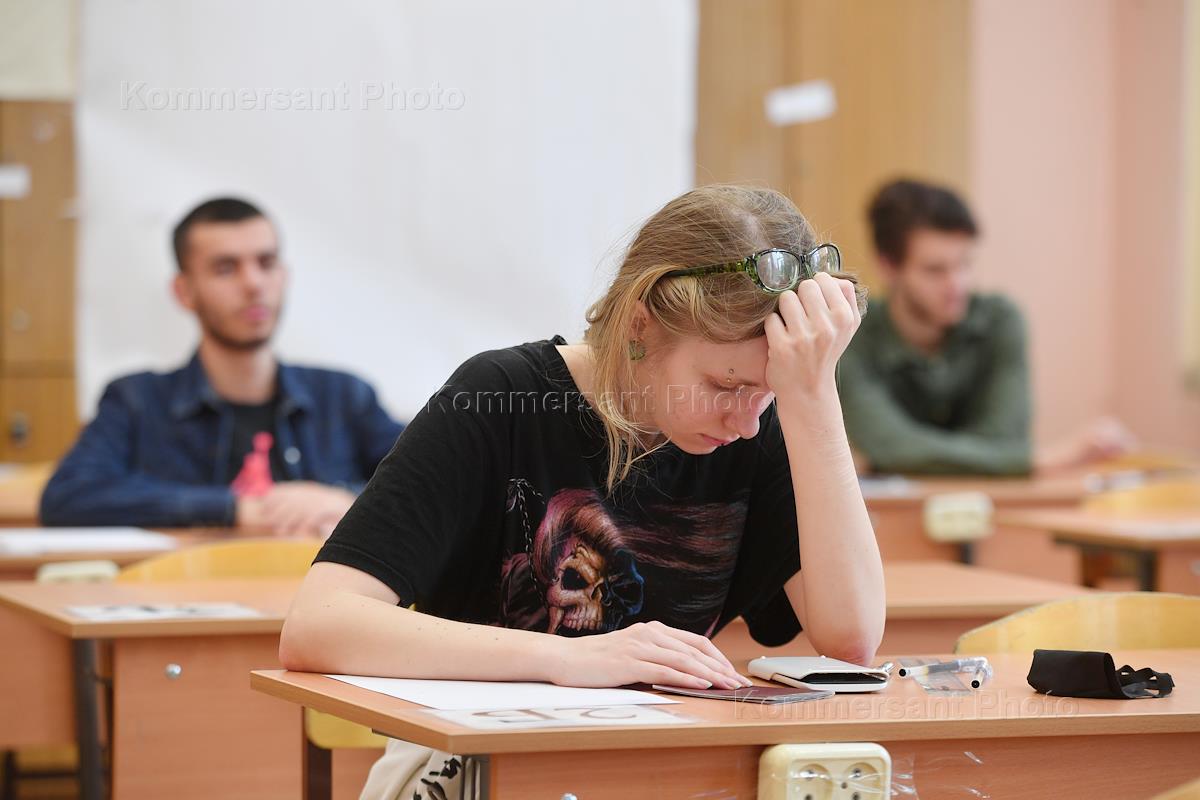 Сдача Единого государственного экзамена (ЕГЭ) по истории в школе № 1251. Школьники во время экзамена.