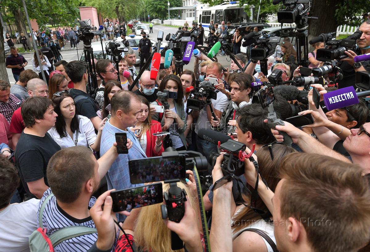 Пикеты в поддержку советника главы "Роскосмоса", бывшего журналиста газеты "Коммерсантъ" Ивана Сафронова у СИЗО "Лефортово". Адвокат Иван Павлов (в центре) во время общения с журналистами на месте пикетов.