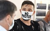 Оглашение приговора бывшему совладельцу страховой компании "Росгосстрах" Сергею Хачатурову в Дорогомиловском районном суде. Жанровая фотография. Мужчина в медицинской маске с надписью: no photos.
