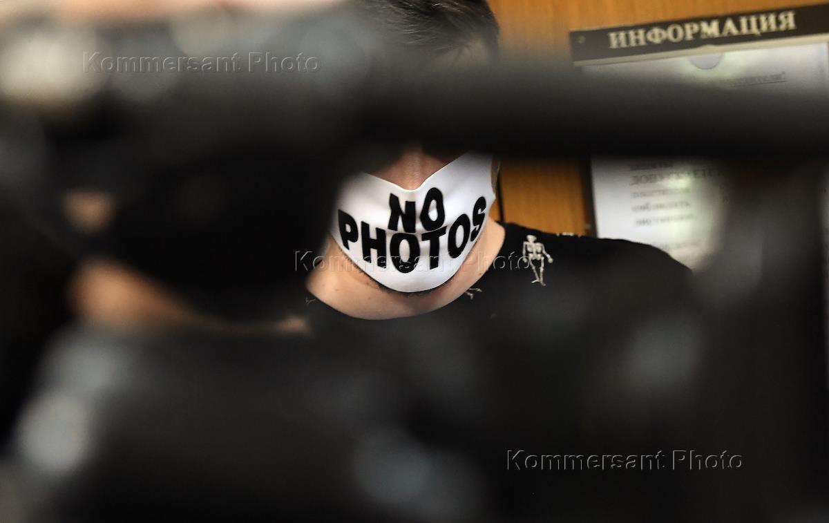 Оглашение приговора бывшему совладельцу страховой компании "Росгосстрах" Сергею Хачатурову в Дорогомиловском районном суде. Жанровая фотография. Мужчина в медицинской маске с надписью: no photos.
