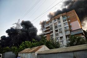 Сотрудники МЧС России во время ликвидации пожара на складе лакокрасочных материалов.
