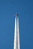 Жанровая фотография. Летящий самолет, оставляющий конденсационный след в небе.