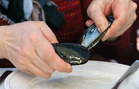 Жанровая фотография. Руки с половинками ракушки мидии. Морепродукты в ресторане.