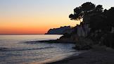 Виды города-курорта Морайра. Силуэты людей на фона отражения заката на море в стеклянной стене ресторана.
