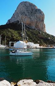 Виды Кальпе. Жанровая фотография. Яхта в гавани на фоне скалы Ифач.