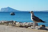 Виды Кальпе. Жанровая фотография. Чайка на бетонном моле на фоне моря и катера.