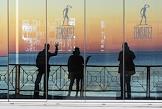 Виды города-курорта Морайра. Силуэты людей на фона отражения заката на море в стеклянной стене ресторана.