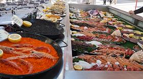 Виды Кальпе. Жанровая фотография. Прилавок с блюдами из морепродуктов в ресторане средиземноморской кухни.